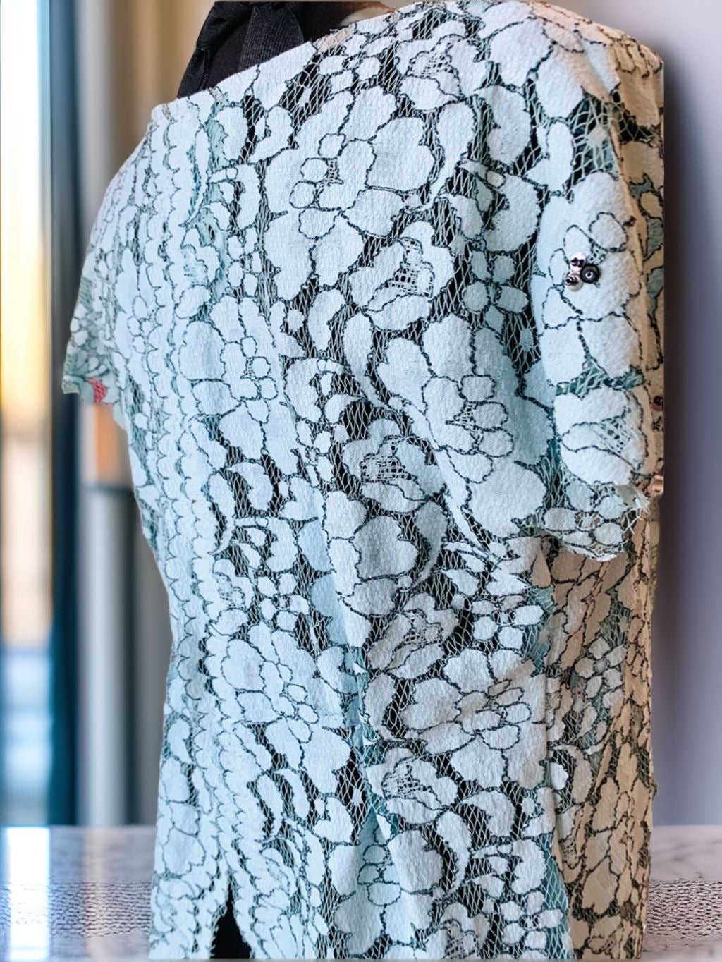 シルバーブルーの花柄レースの上着はサイズフリー。