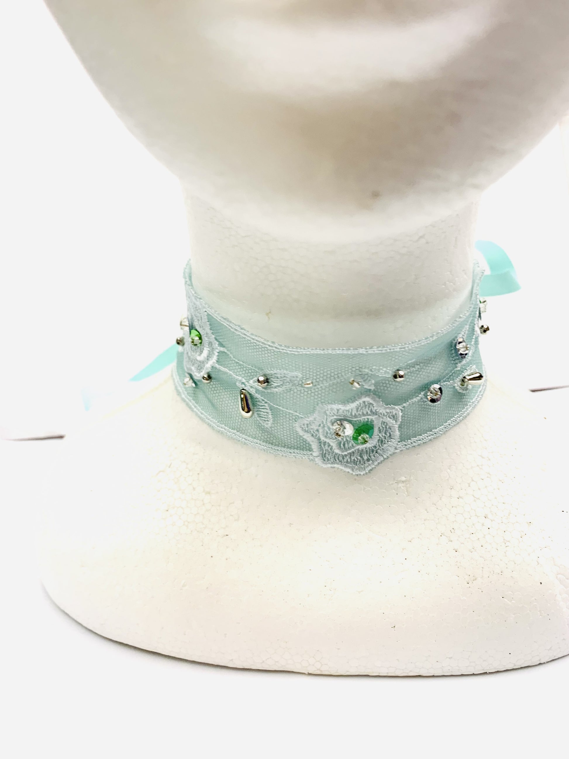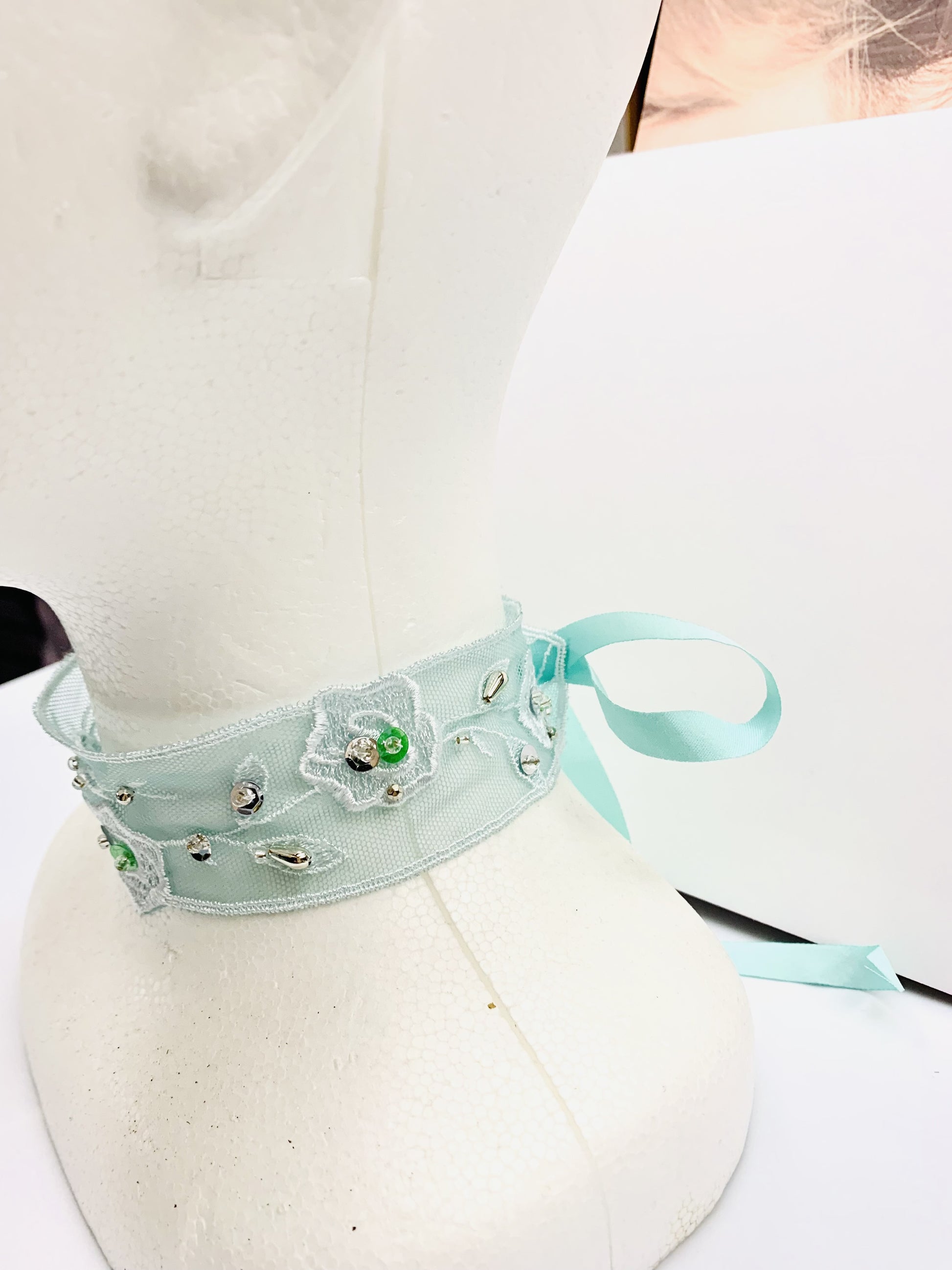 シンプルなドレスに👗レースモチーフチョーカー ハンドメイドの刺繍を施しトータルな美しさに華を添えます。